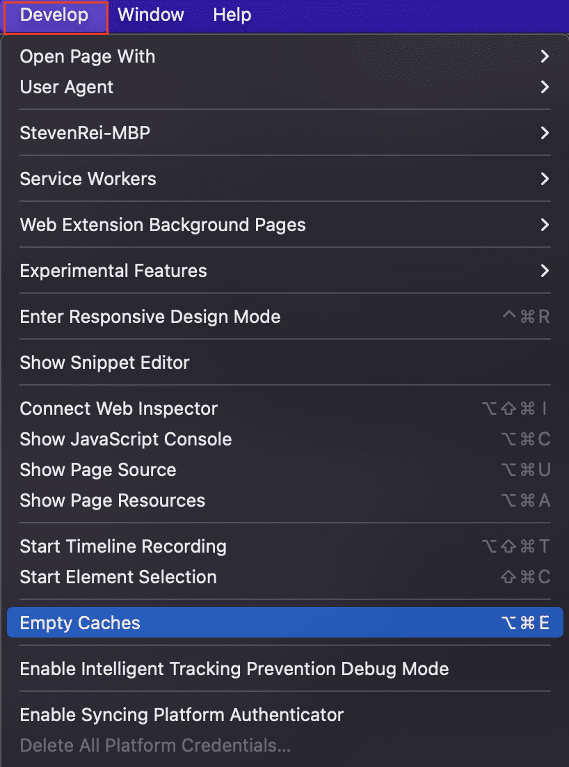 Después de eso, busca la pestaña Desarrollar en tu barra de menú, luego selecciona Vaciar cachés: