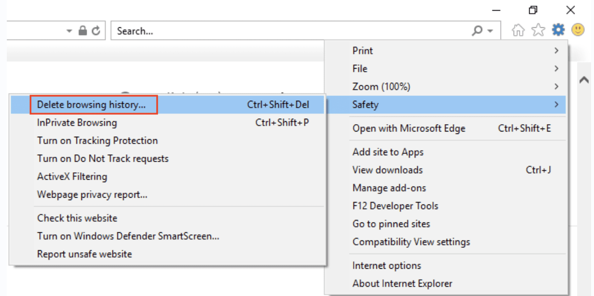 En la ventana de Internet Explorer, haz clic en el ícono de engranaje en la esquina superior derecha y ve a Seguridad > Eliminar historial de navegación.