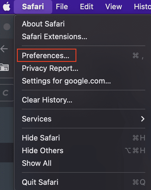 En una ventana de Safari, haz clic en Safari en la barra de menú y ve a Preferencias: