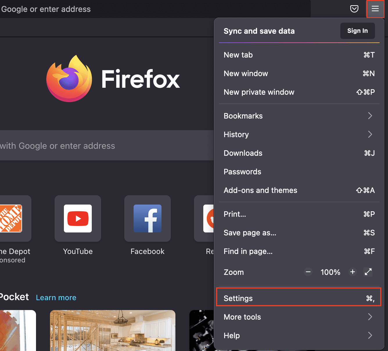 En una ventana de Firefox, haz clic en el ícono de librero en la esquina superior derecha > Configuración