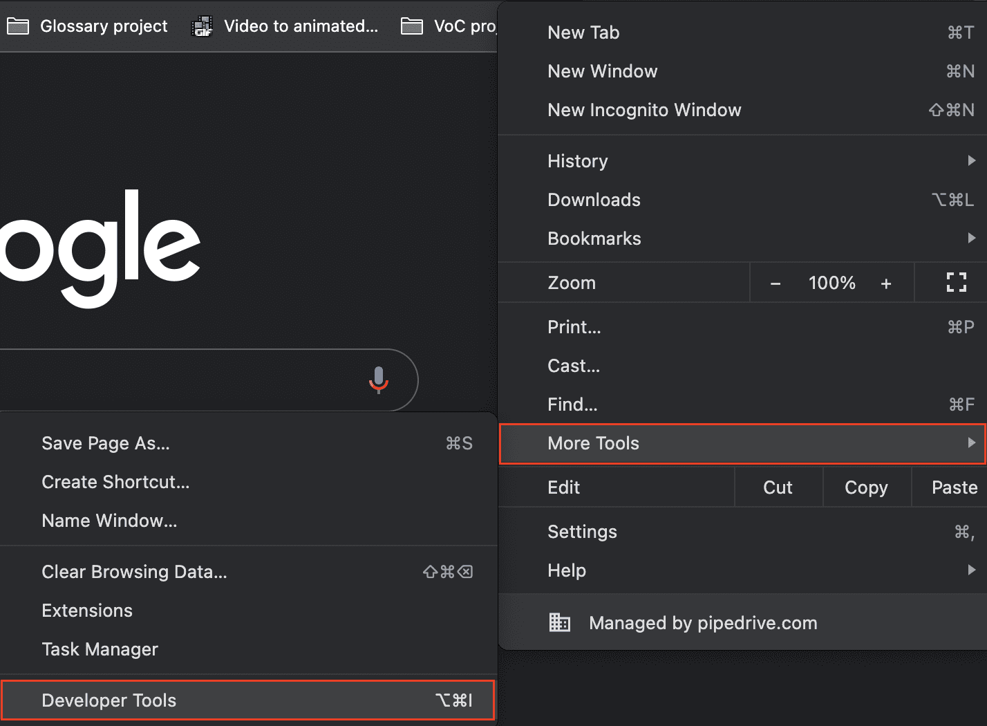 Para borrar el caché de una sola página web, comienza por navegar hasta «…» en la esquina superior derecha de tu navegador, luego selecciona Más herramientas > Herramientas para desarrolladores: