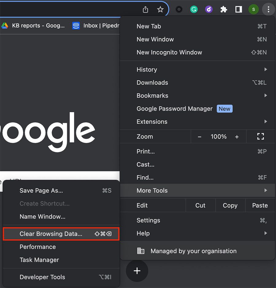 En una ventana de Chrome, haz clic en «…» > Más herramientas > Borrar datos de navegación.