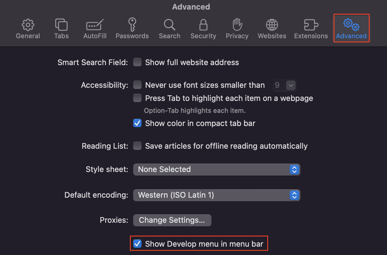 En la ventana que aparece, selecciona Avanzado y luego asegúrate de que la casilla Mostrar menú de desarrollo en la parte inferior esté marcada: